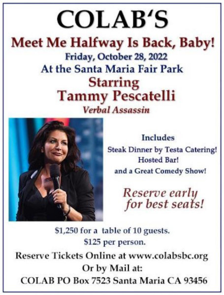 Friday, October 28th, 2022 at the Santa Maria Fair Park Colab is hosting a steak dinner with special guest ‘The Verbal Assasin’ Tammy Pescatelli.