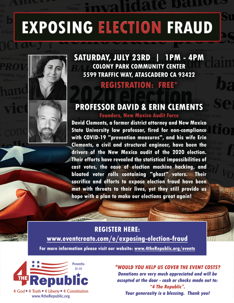 DAVID CLEMENTS, former Law Professor, New Mexico State University, former Deputy District Attorney, 12th Judicial District Attorney’s Office, former Senior Trial Attorney, 3rd and 6th Judicial District Attorney’s Office, New Mexico will be speaking on exposing election fraud. Venue to be determined