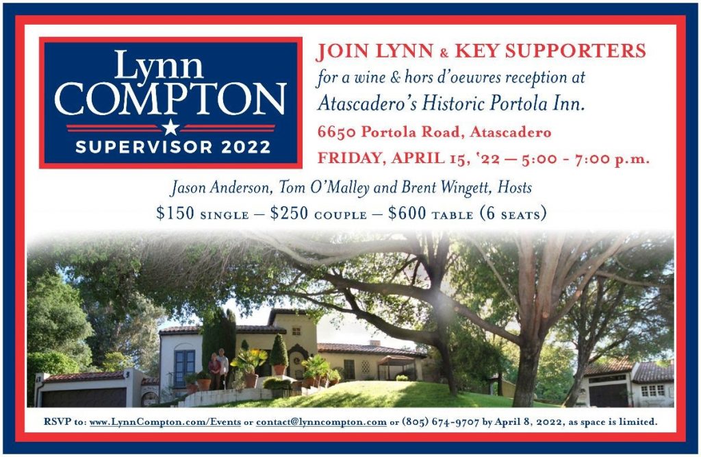 Enjoy a Beautiful Evening in the Historic Portola Inn Carriage House with District 4 Supervisor, Lynn Compton. This intimate fundraiser with a very limited number of tickets is the perfect opportunity to help support her in her reelection campaign. Wine and Heavy Hors d’oeuvres will be served.