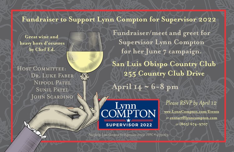 Enjoy a wonderful evening at the Country Club in San Luis Obispo with District 4 Supervisor, Lynn Compton. This cozy fundraiser is a fantastic opportunity to help support her in her reelection campaign. Wine and Hors d’oeuvres by Chef Ed will be served.